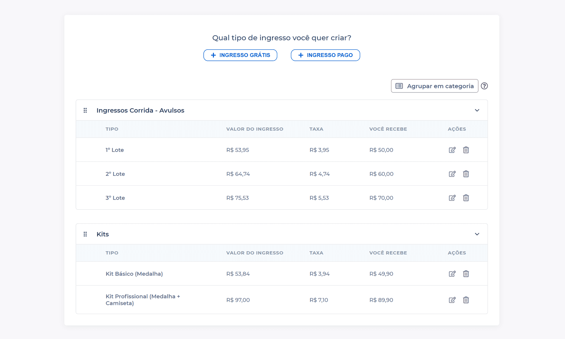 Com a Eventiza você pode criar categorias de ingressos, ou ainda comercializar kits (camisetas, bonés/viseiras, suplementos, etc.) e itens adicionais com limite de estoque.