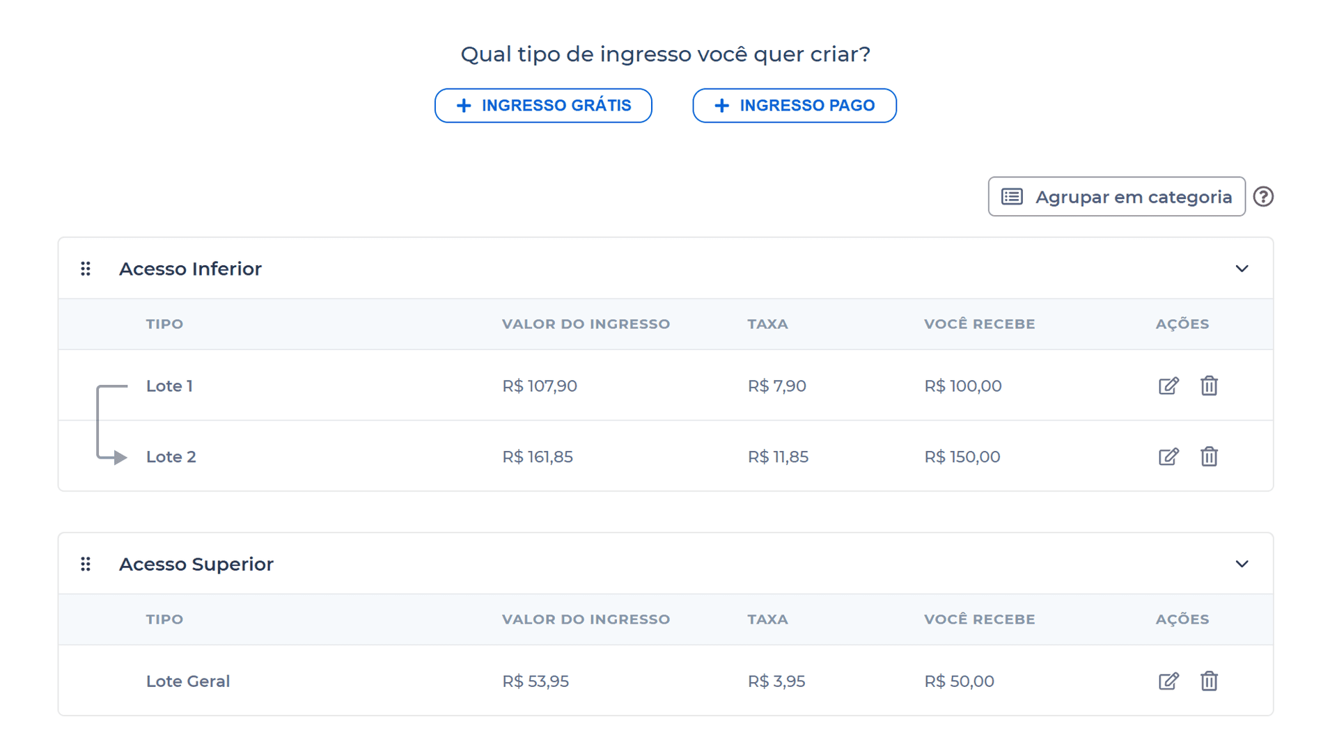 Além disso você pode criar diferentes categorias para organizar os seus ingressos, facilitando a organização do seu evento, e especialmente a visualização e o processo de compra dos seus participantes.
